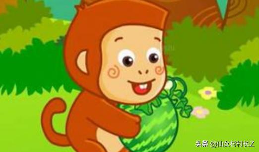 小猴子捧着几个桃子,走到一片瓜地里。它看见满地的西瓜又大又圆,非常高兴,就扔了桃子去摘西瓜。小猴子抱着一个大西瓜往回走。