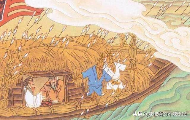诸葛亮向前来监视的鲁肃要了20只、30个军士以及一千多个草把子,鲁肃答应了,但是两天过去了,诸葛亮都没有动静,直到第三天四更的时候,诸葛亮才请鲁肃一起去船上。这天大雾弥漫,很难见人,到曹军水寨的时候,诸葛亮让船一字排开,命士兵击鼓呐喊,曹操看见雾气浓重,怕中埋伏,便命令弓箭手往船上射箭。