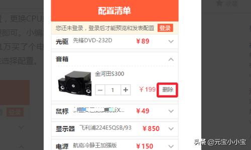 7、最后在右边会显示我们的装机配置单,当然如果你感觉价格便宜了,你可以删除这里的配件,然后重新选择更好的硬件配置,更换CPU或者主板等等。让价格符合自己心里预期,并且电脑可以满足自己的日常需要即可。