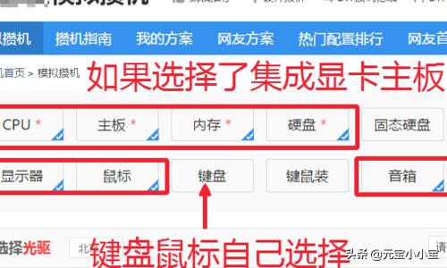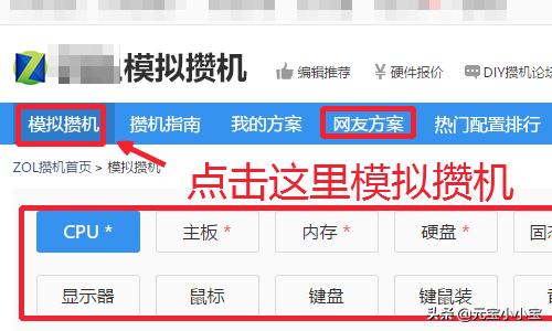 2、打开以后,我们可以看看大家的方案,然后自己模拟攒机,这里我们一样一样的选择电脑配置。比如CPU,主板,内存,显卡,硬盘,电源等,配件。如图所示。