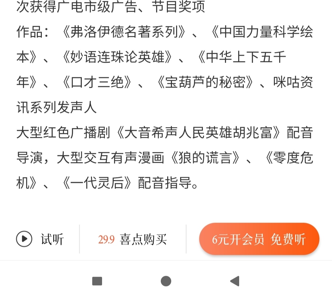 2.试着点击第一个,就会出现以下情况、最下边有试听、喜点购买和6元开会员免费听!这里就知道喜马拉雅有些是要收费的了