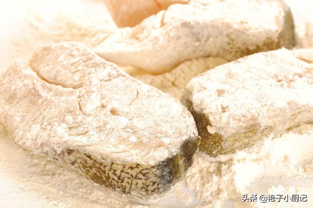 步骤3,腌制入味之后,倒入一些面粉进去,不需要太多,稍微让鱼块表层裹上面粉就可以了。