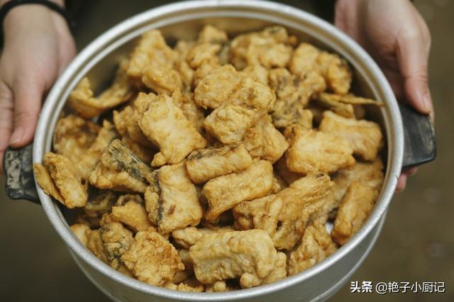 3.烧油,180度下鱼块,先不要动鱼块,等15-20妙后,用产散开鱼块.炸到金黄,脆骨,(最好是等鱼块冷后再重炸一次),鱼块就更脆