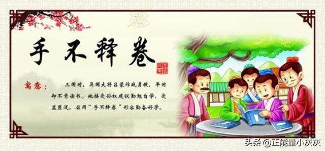 三国时期吴国大将吕蒙没有文化知识,孙权鼓励他学习史书与兵法。吕蒙总是推脱军队事务没有时间学习,孙权说:"时间挤挤就有了。”以前汉光武帝在行军作战的紧要关头,手里还总是拿着一本书不肯放下来,为什么你就没有时间呢?"接着又说:"你的事情总没有我多吧?我并不是让你去研究学问, 只要你翻阅一些古书,从中得到一些启发罢了。"吕蒙说:"但是我不知道应该去读哪些书?"孙权听了,微笑着说:"你可以先读兵法书, 再读历史书,这些书对于以后带兵打仗都有好处。吕蒙听了孙权的话,回去便开始读书学习,从此手不释卷,并坚持不懈。最后做了吴国的主将,有勇有谋,屡建奇功。
