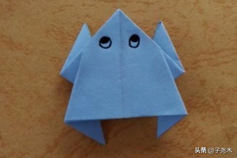 2、把左右两边的角分别向上折,注意要倾斜着折,翻过来,把左右两边的角分别向内折,折出青蛙的脚,最后画上眼睛,小青蛙就出来了。
