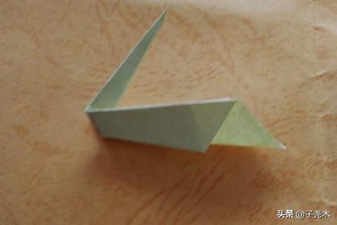 2、把尖尖的一边向内折,把其中的一部分再折回来,这是小鸭子的头部,最后用笔画上小鸭子的眼睛,这样小鸭子就完成了。