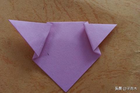 1、将正方形折纸其中的两个角对折,把右边的角先向左折一下,再往回一点,同样左边的角先向右折,再向左折,这样小猪的耳朵就出来了;