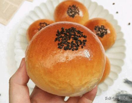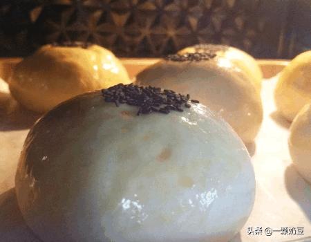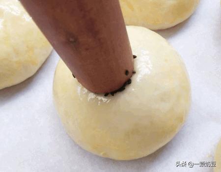 11、表面刷上鸡蛋液,擀面杖一端沾鸡蛋液后沾上黑芝麻,轻轻地压在面团中间。