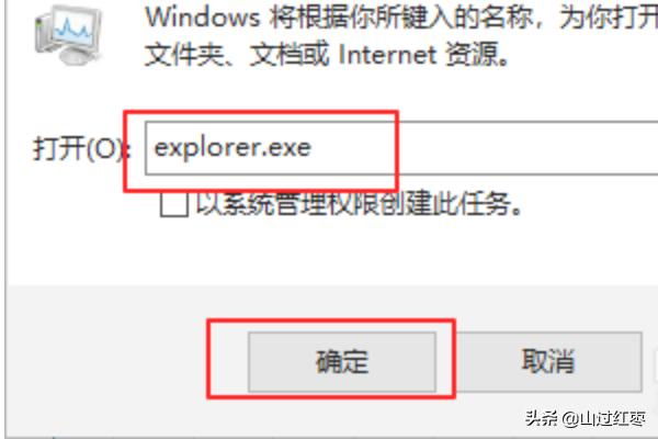 4、然后在弹出窗口,新建任务窗口中输入“explorer.exe”,最后点击“确定”。