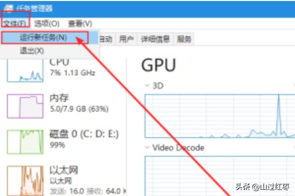 3、进入任务管理器界面后,点击左上方的“文件”,选择“新建任务”。