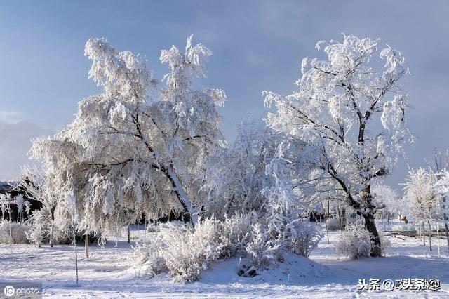 两旁一片银白,道旁的树上都挂满了白色冰晶所形成的雾凇雪挂,处处银妆素裹,好一派北国风光。