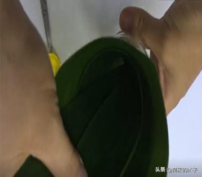 第三步,拿二张粽叶不完全重叠,对叠折, 弯成勺状
