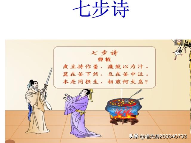 曹植打一激灵,边走也吟:“煮豆持作羮,瀝菽以为汁。萁在釜下燃,豆在釜中泣,煮豆燃豆萁,豆在釜中泣。本自同根生,相煎何太急?”曹丕听罢心中惭愧,只好做罢。