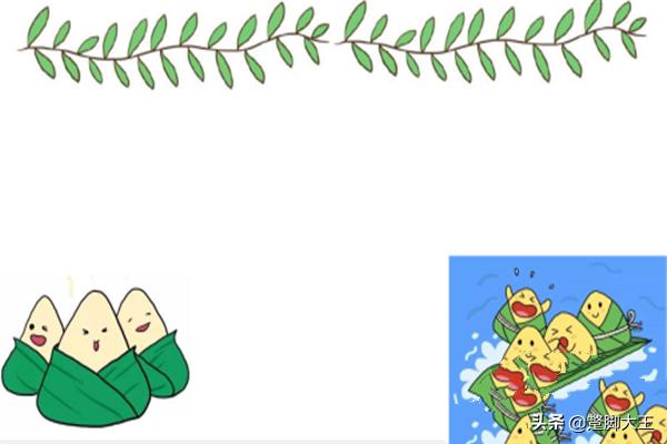 在画纸的左下方画上三个粽子的儿童画,在画纸的右下方画上一个粽子划龙舟的儿童画,画出的效果如图所示。